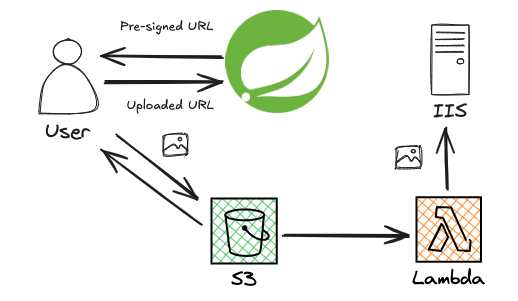 클라이언트 단에서 API를 통해 Pre-signed URL을 발급받아 S3에 직접 업로드 하고, 업로드 된 경로만 db에 저장하는 방식. + IIS 파일 동기화는 S3 버킷 업로드 이벤트 트리거를 활용하여 AWS Lambda로 처리