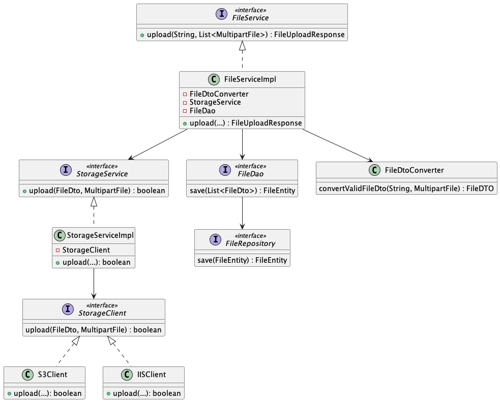 - StorageService는 StorageClient를 통해 S3, IIS에 각각 업로드 후 업로드 여부 반환